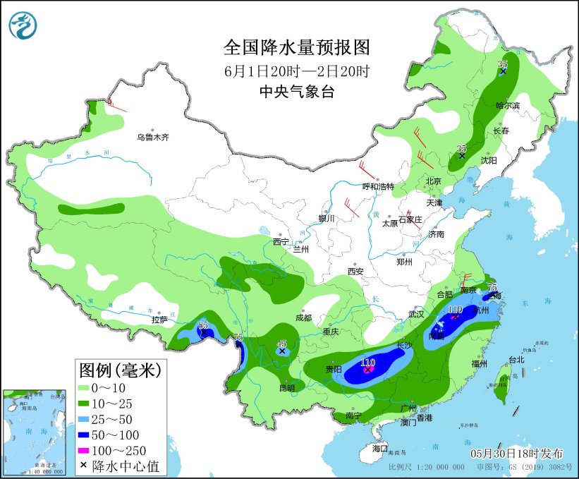 *6月1日20時至2日20時,*新疆伊犁河谷和南疆南部山區、東北地區西部、西藏東南部、青海南部、江淮西部、江南大部、西南地區南部、華南大部、台灣島等地部分地區有中到大雨,其中,西藏東南部、安徽南部、上海南部、湖南中部和南部、江西北部、浙江中北部、貴州東南部、雲南西北部、廣西北部等地部分地區有暴雨或大暴雨(100~110毫米)。內蒙古中部、新疆沿天山地區、華北大部、江淮北部等地部分地區有4~6級風,陣風7~8級(見圖3)。