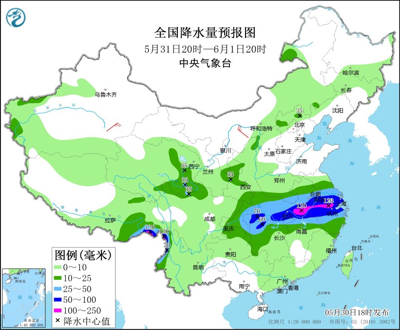 *5月31日20時至6月1日20時,*5月31日20時至6月1日20時,西藏東部、青海東部、甘肅東部、黃淮西部、江淮大部、江漢、江南北部和東部、川西高原北部、西南地區東部、雲南西部等地部分地區有中到大雨,其中,西藏東南部、青海東南部、河南東南部、安徽中南部、江蘇南部、上海大部、重慶東部、湖北中部和南部、湖南北部、江西北部、浙江中部和北部、雲南西北部等地部分地區有暴雨或大暴雨(100~120毫米)。內蒙古中部、新疆南疆盆地等地部分地區有4~5級風(見圖2)。