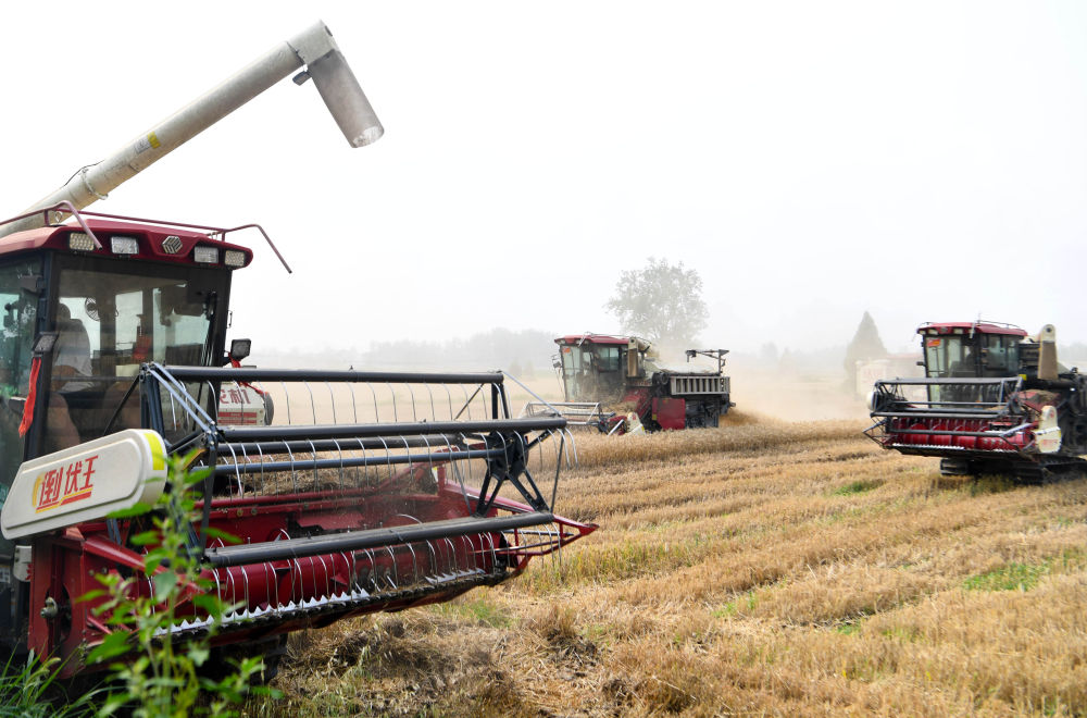 新華社鄭州5月29日電(記者馬意翀)在位於河南省信陽市淮濱縣馬集鎮的麥田中,農機轟鳴,隨着數十台履帶式收割機來回穿梭,成片的弱筋小麥被快速收割、脱粒,飽滿的麥粒如瀑布般傾瀉進運輸車輛……眼下,農業大省河南麥收工作如火如荼,麥田搶收正在“與時間賽跑”。