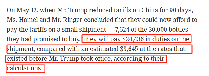 眼下,大多數從中國進口商品的關税從145%降至30%,但受制造材料和美國貿易分類方式的影響,這一運動水壺品牌的產品面臨的關税要高於30%。該品牌負責人哈梅爾和林格計算,他們將為一批貨物支付24436美元的關税——而要是在去年,這批貨物的關税僅為不到3700美元。