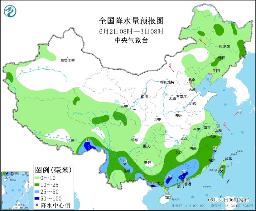 6月2日至6月3日,雨帶南壓,華南、雲南中東部等地仍將有中到大雨,部分地區暴雨,局地大暴雨。