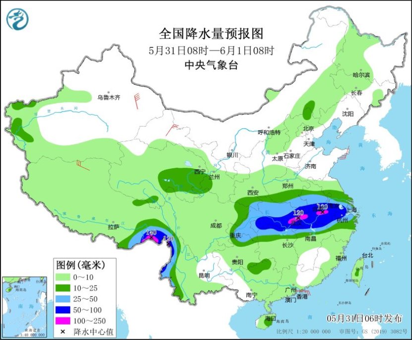 今日,貴州北部、重慶、湖北、湖南北部、江西北部、安徽中南部、江蘇西南部、浙江中北部及西藏東南部、雲南西部等地部分地區有大到暴雨,安徽中南部、湖北南部、西藏東南部、雲南西北部等地部分地區有大暴雨(100~140毫米);上述局地伴有雷暴大風等強對流天氣。