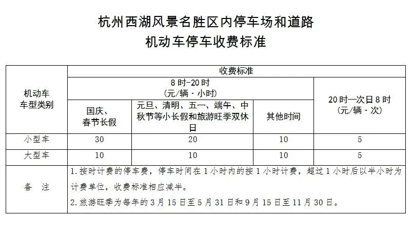依照相關部門規定,端午法定假期期間,西湖景區價格浮動的政府定價停車場具體收費標準如下:白天(8時—20時)小型車20元/輛·小時,大型車10元/輛·小時;夜間(20時—次日8時)大、小型車均為5元/輛·次。