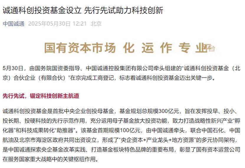 誠通科創投資基金完成工商登記 規劃總規模300億元