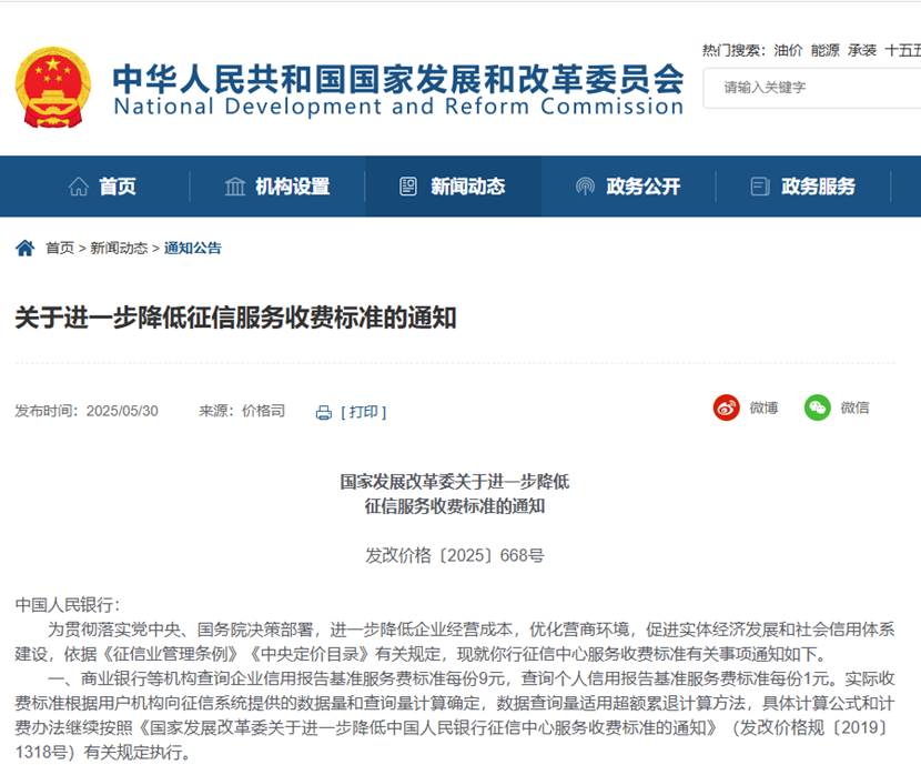 【環球網財經綜合報道】據國家發改委網站5月30日消息,為進一步降低企業經營成本,優化營商環境,促進實體經濟發展和社會信用體系建設,近日國家發展改革委印發《關於進一步降低徵信服務收費標準的通知》(下稱《通知》),自2025年7月1日起執行。