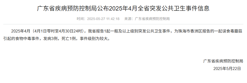 近日,廣東省疾病預防控制局公佈了今年4月全省突發公共衞生事件信息。2025年4月(4月1日零時至4月30日24時),廣東報告1起一般及以上級別突發公共衞生事件,為珠海市香洲區報告的一起誤食毒蘑菇引起的食物中毒事件,發病3例,死亡1例,事件級別為較大。