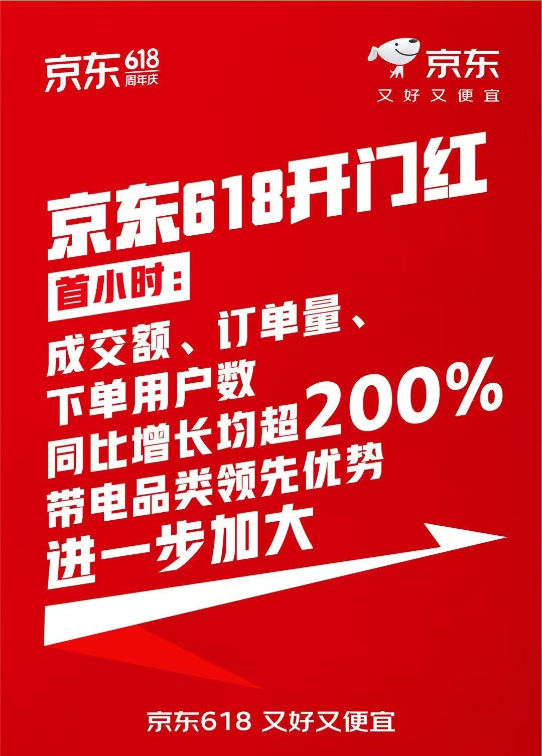 【環球網科技綜合報道】5月31日消息,記者從京東方面獲悉,開門紅1小時,京東618成交額、訂單量、下單用户數同比增長均超200%,超2萬個品牌成交額同比增長超3倍。帶電品類領軍優勢進一步加大,首小時,帶電品類成交額同比增長超380%,Apple、小米、美的、華為、海爾等品牌成交額迅速破億元,超500個家電家居品牌成交額同比增長超10倍,中國十大智能家電家居品牌成交額同比增長超5倍。以遊戲本、高端耳機/音箱、智能機器人為代表的上萬個3C數碼趨勢單品,成交額增長均超10倍。