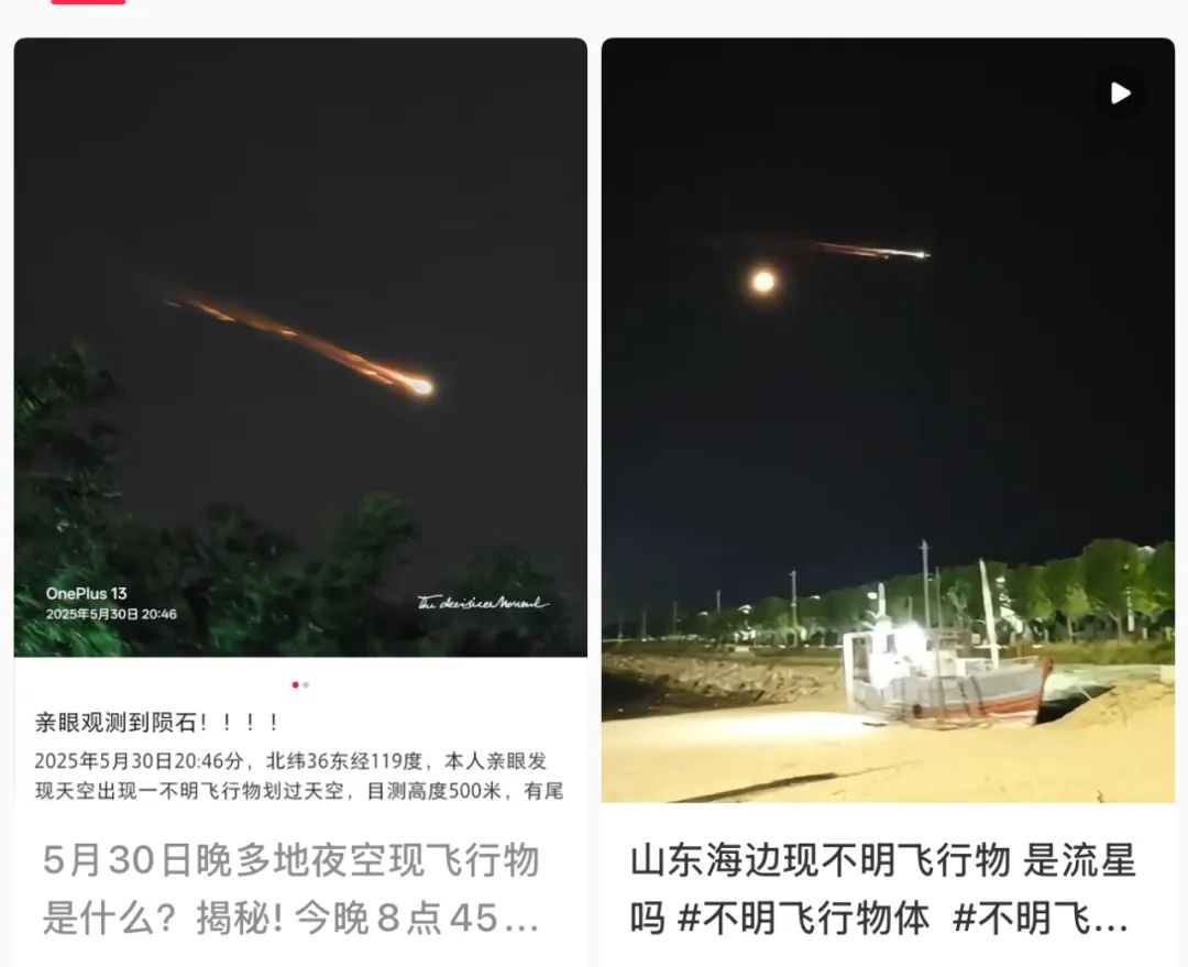5月30日晚,山東濰坊、日照等地的許多網友在社交媒體發佈視頻,稱夜空中有不明飛行物飛過。此外,江蘇、安徽等地的網友也發表視頻稱,看到了夜空中的不明飛行物。