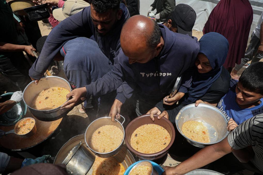 5月28日,人們在加沙城西部的沙提難民營領取救助食物。新華社發(裏澤克·阿卜杜勒賈瓦德攝)