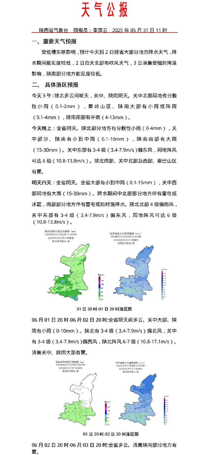 受低槽東移影響,預計今天到2日我省大部分地方降水天氣,降水期間能見度較低,2日白天北部有吹風天氣,3日清晨受輻射降温影響,陝南部分地方能見度較低。6月1日:全省陰天,陝北有分散性小雨或雷陣雨,關中、陝南有小雨,秦嶺山區西段部分地方有中雨,降水期間伴有雷電。