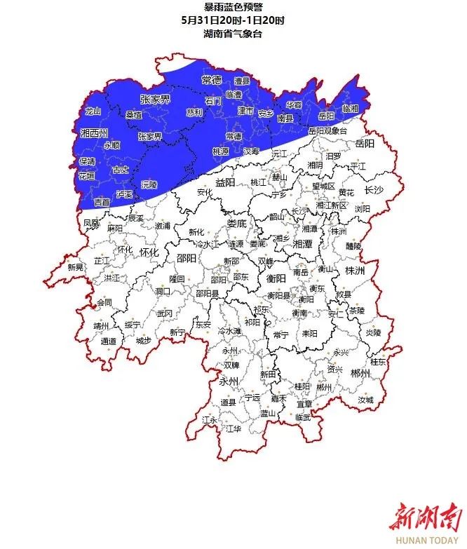 暴雨藍色預警顯示,預計5月31日20時至6月1日20時,岳陽北部、常德、張家界、益陽東北部、湘西土家族苗族自治州將出現暴雨,並伴有短時強降水、雷雨大風等強對流天氣。