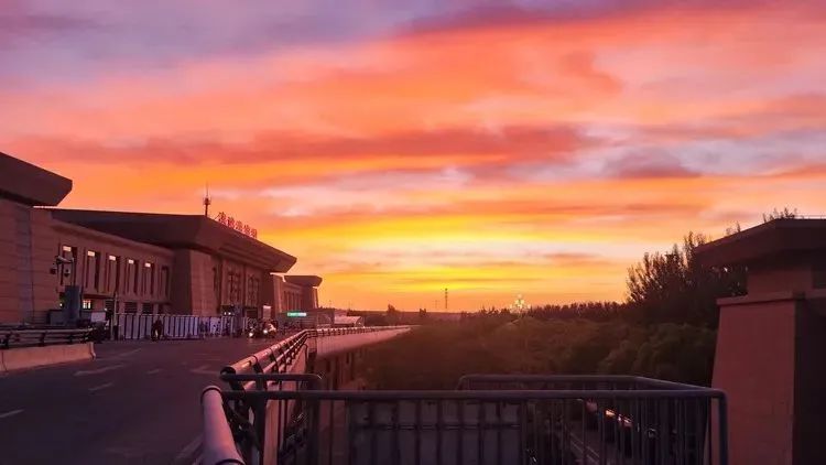 祁連山收攏最後一縷鎏金時,鋼鐵鑄就的站台正被晚霞浸透,七色雲靄在幕牆上流淌,像大漠雄關遺落的金戈纏繞着現代文明的稜角。戈壁風掠過千年烽燧,將晚照揉碎在鋼軌織就的五線譜上。動車長鳴刺破胭脂色的天穹,與漢長城殘垣遙相望。候車廳的燈火次第亮起,橘色光暈漫過月台,恰似烽火台上永不熄滅的戍邊篝火。此刻的嘉峪關南站,是絲綢之路上的駝鈴,正載着歸人的笑語,駛向星子初綻的蒼茫。
