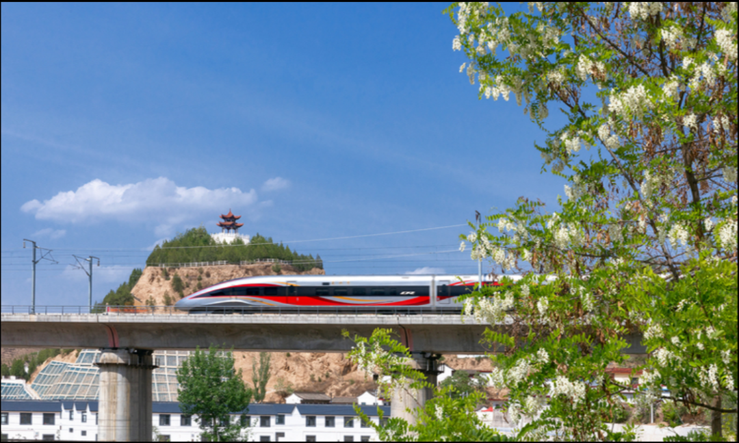 “龍鳳呈祥”,舞動西部山河。5月2日,寶蘭高鐵沿線正是槐花盛開季節,一列復興號智能型動車組,行駛在天水南至秦安區間,帶着一路槐香從渭紅新村駛過。復興號智能型動車組,外形塗裝採用傳統“龍鳳呈祥”主題,銀灰色車身,“龍型”車頭,由“國旗紅”“故宮紅”“祥龍黃”組成三色“鳳尾”上下舞動、交織纏繞車身,寓意“龍騰四海、鳳舞九天”,充滿傳統文化韻味,表達了對祖國繁榮昌盛、人民幸福安康的美好祝福。