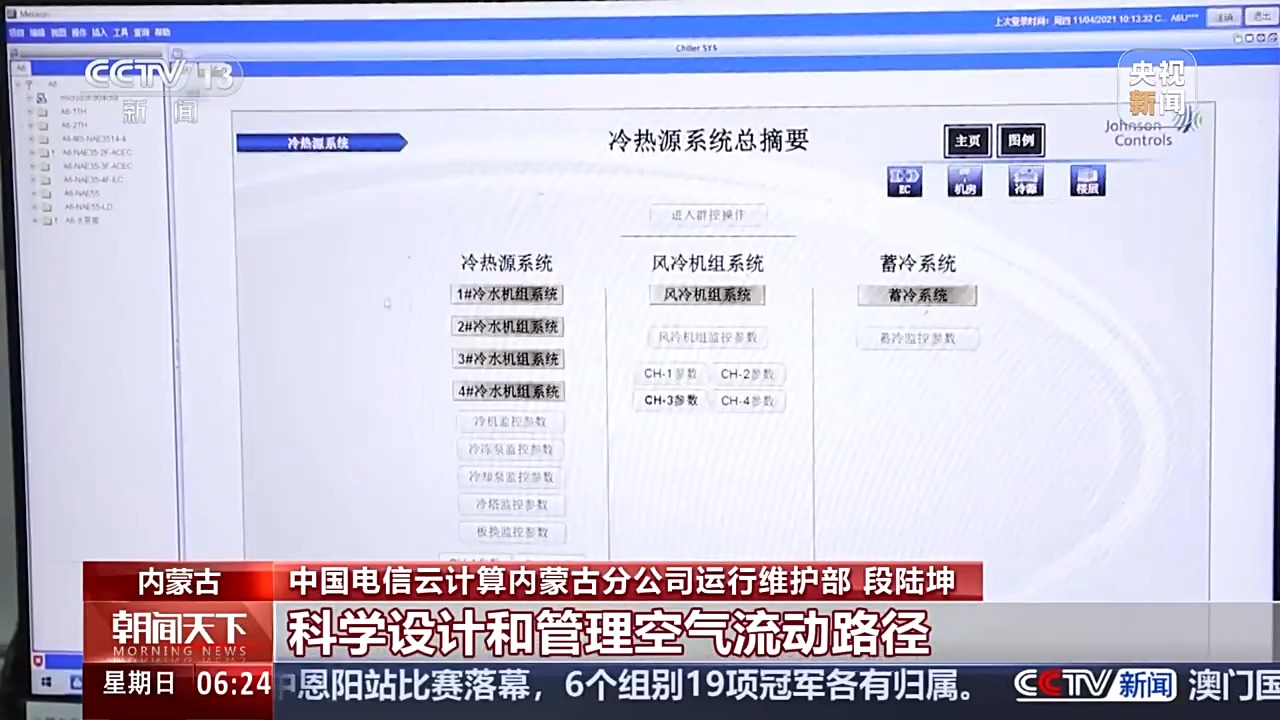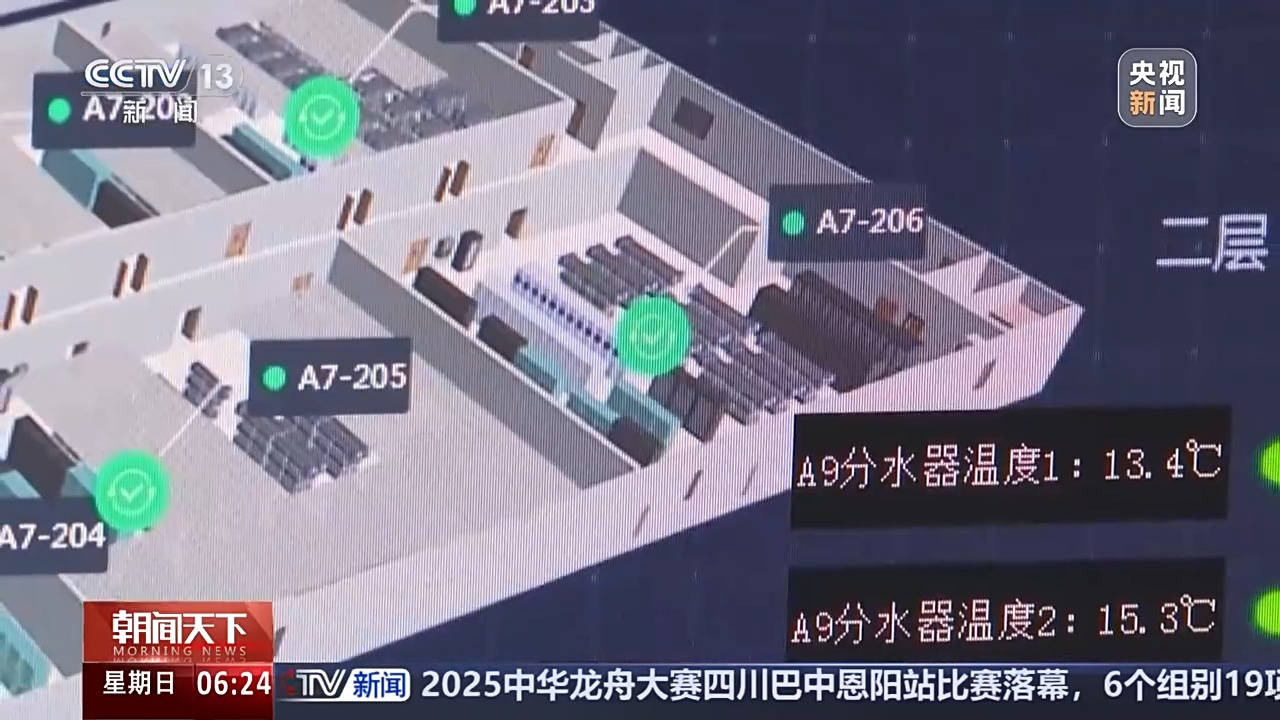 *總枱央視記者 張叢婧:*這裏用上了智能温控系統,可以看到,它能即時採集機房裏每個區域的温濕度情況,通過算法自動調節每台空調的温度和風速,就像“智慧大腦”,可以給服務器定製製冷方案,最大程度節能降耗。