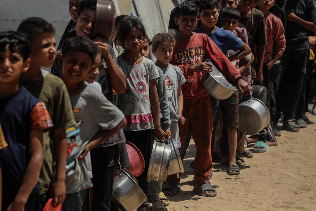 5月28日,孩子們在加沙城西部的沙提難民營等待領取救助食物。新華社發(裏澤克·阿卜杜勒賈瓦德攝)