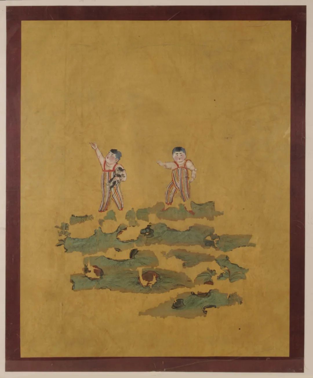 他們在玩什麼呢?畫面中,兩個胖嘟嘟的兒童正在綠草如茵的户外玩耍嬉戲。他們頭髮烏黑濃密,面若桃花,上身裸露,穿藍、白、紅、黃、綠五色相間的條紋揹帶褲,腳蹬紅鞋。左邊的孩童右手高舉做放飛狀,左手抱一黑白相間的捲毛小狗;右邊的孩童凝神注目,彷彿發現了什麼,正招呼着同伴。雙童形象生動,童趣盎然,逗人喜愛。