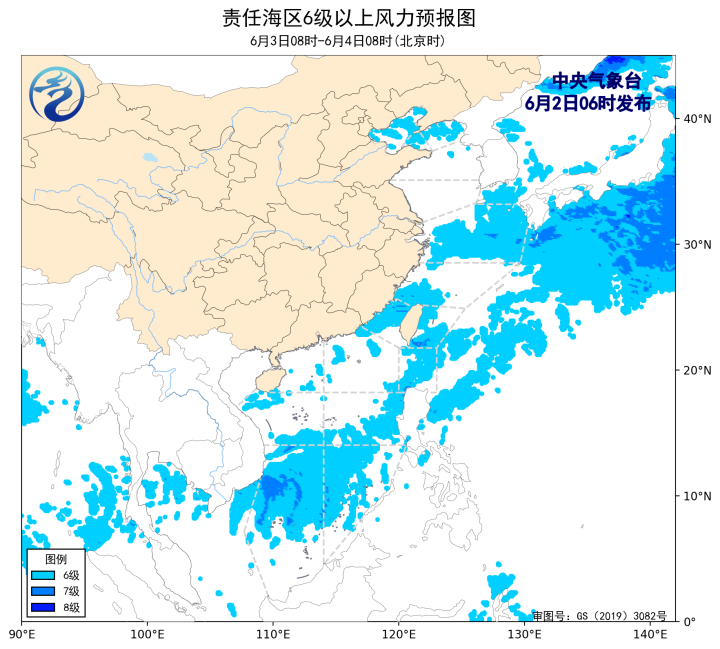 6月1日14時至2日02時,東海北部海域出現了5~6級、陣風7級的偏東風,東海南部海域、台灣以東洋麪、巴士海峽、南海西北部海域、北部灣、南海南部海域出現了5~7級、陣風8級的偏南風或西南風。東海西北部海域出現了能見度不足1公里的大霧。