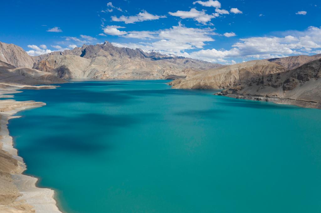 位於新疆塔什庫爾干塔吉克自治縣的“班迪爾藍湖”一角(2023年8月28日攝,無人機照片)。新華社記者 胡虎虎 攝