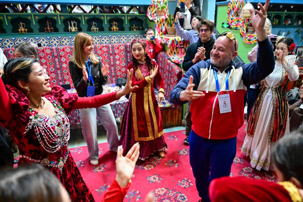 在新疆喀什古城景區“古麗的家”旅遊家訪點,第六屆世界媒體峯會的與會嘉賓和當地居民一起舞蹈(2024年10月16日攝)。新華社記者 丁磊 攝