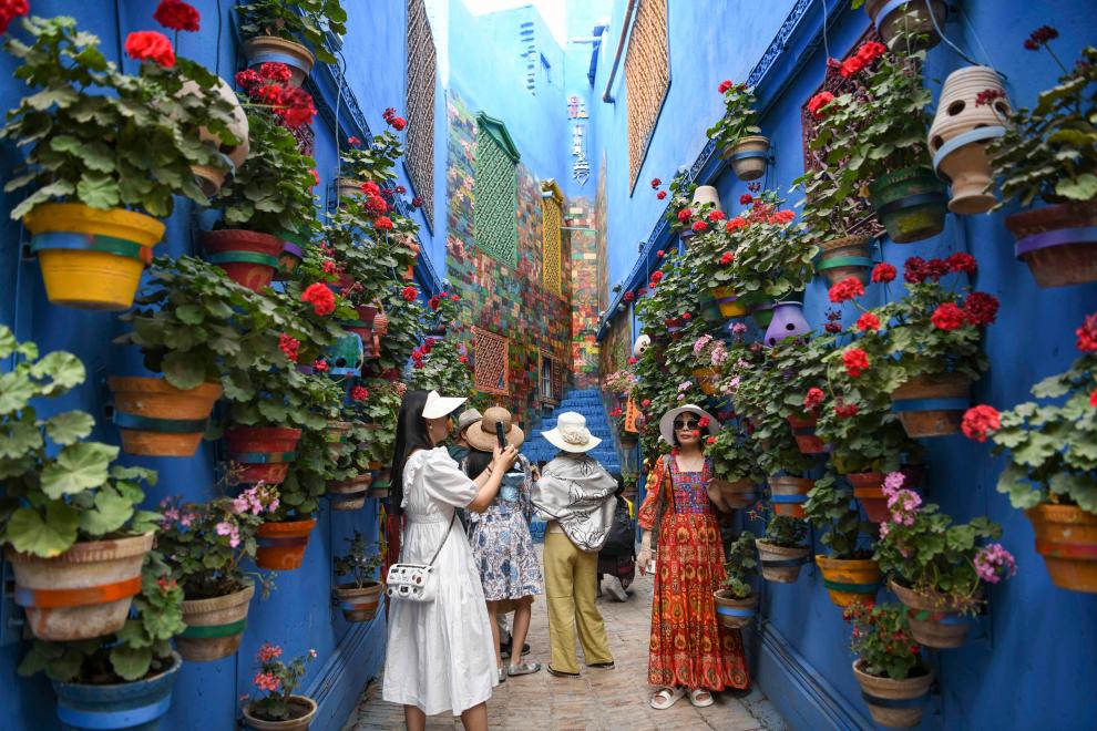 人們在新疆喀什古城景區彩虹巷內遊玩拍照(2023年6月14日攝)。新華社記者 胡虎虎 攝