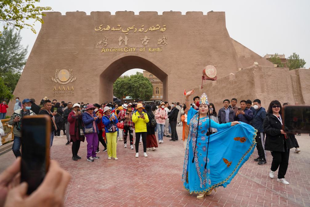 在新疆喀什古城景區,遊客打卡拍照(2023年4月21日攝)。新華社記者 丁磊 攝