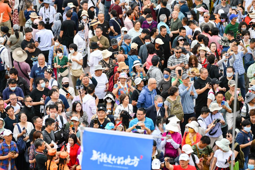 遊客在新疆喀什古城景區東大門觀看“開城儀式”(2023年3月10日攝)。新華社記者 胡虎虎 攝