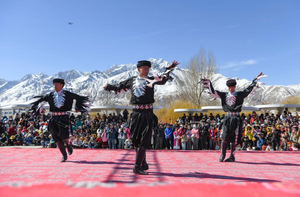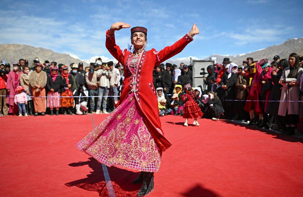 在新疆塔什庫爾干塔吉克自治縣提孜那甫鄉賽馬場,參與非遺展演的村民在跳舞(2025年3月23日攝)。新華社記者 胡虎虎 攝