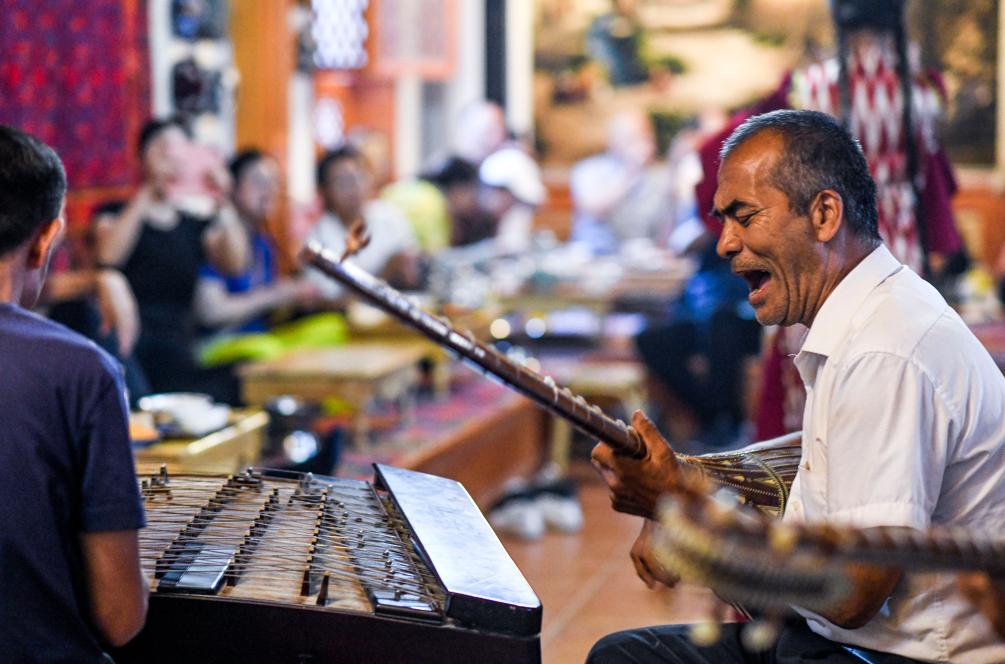 樂手在新疆喀什古城百年老茶館內彈唱(2023年9月15日攝)。新華社記者 王菲 攝