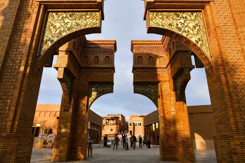 遊客在新疆喀什高台民居歷史文化街區遊玩(2023年6月14日攝)。大門上方的裝飾圖案和文字源自出土於新疆的文物——“五星出東方利中國”織錦。新華社記者 胡虎虎 攝