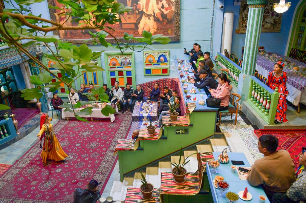 遊客在新疆喀什古城景區的一家民宿內欣賞歌舞表演(2024年4月29日攝)。新華社記者 王菲 攝