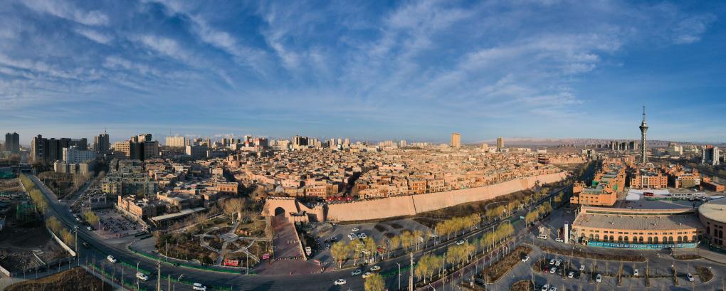 清晨,灑滿陽光的喀什古城(2023年3月10日,無人機拍攝)。新華社記者 李響 攝