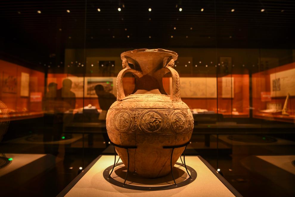 這是在新疆喀什地區博物館拍攝的國家一級文物“三耳壓花陶罐”(2023年6月12日攝)。新華社記者 胡虎虎 攝