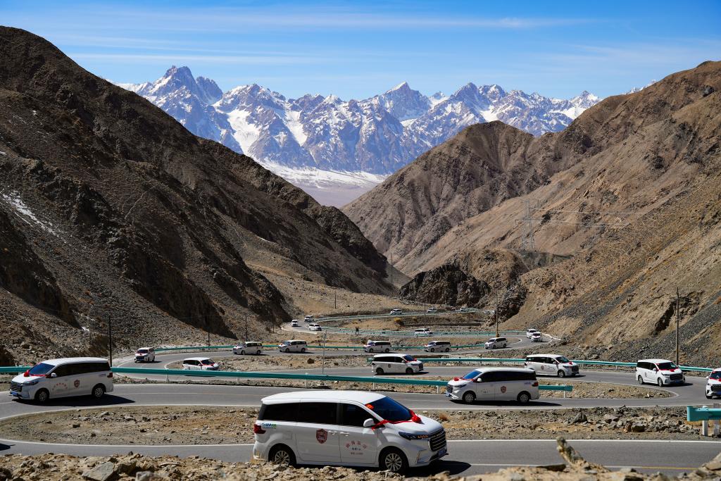 在新疆塔什庫爾干塔吉克自治縣,參加“盤龍古道”恢復通車儀式的車隊在行進中(2025年3月22日攝)。新華社記者 徐宏巖 攝
