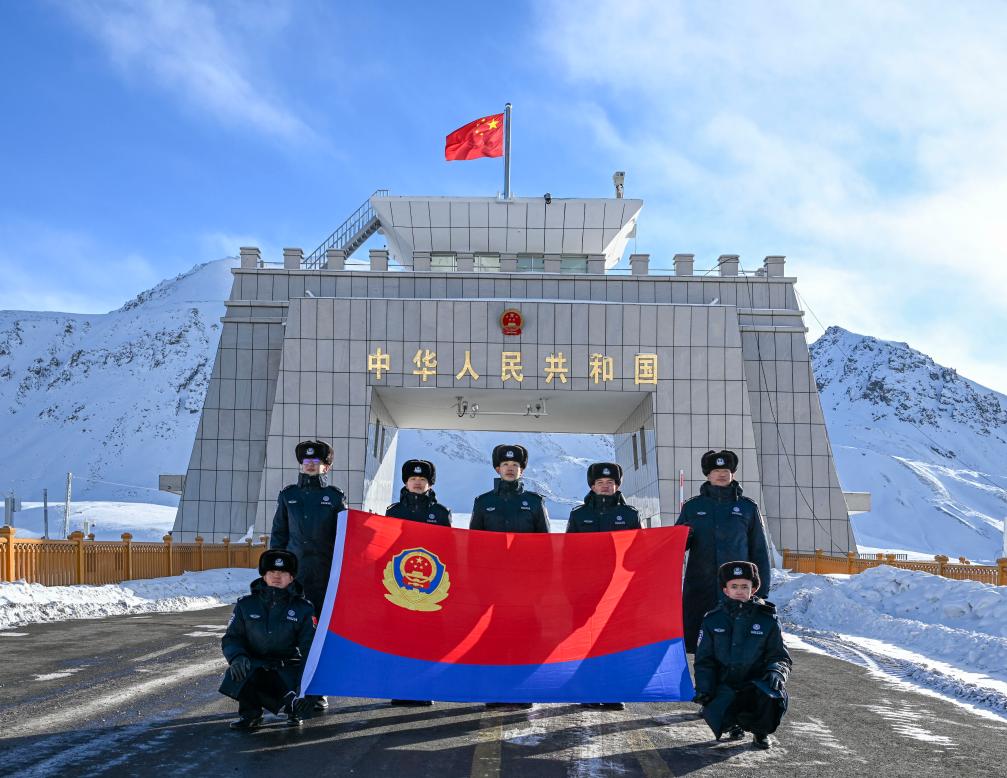 新疆紅其拉甫出入境邊防檢查站新警在紅其拉甫國門前與警旗合影(2025年1月10日攝)。新華社記者 陳朔 攝