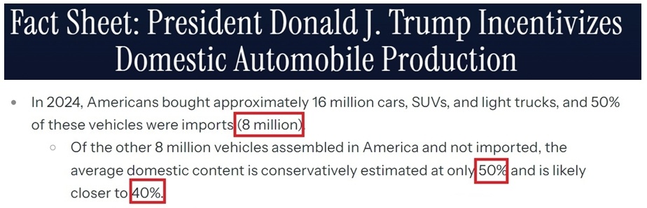 白宮數據顯示,2024年美國進口了約800萬台汽車,佔全年汽車銷量的一半。剩餘一半在美國組裝的汽車中,國內零部件價值佔比僅約為40%到50%。