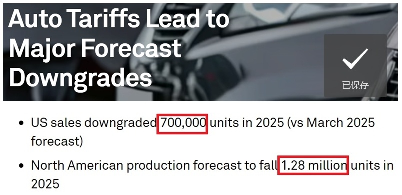 標普全球汽車的一份報告顯示,如果美國持續對進口汽車加徵高額關税,2025年美國汽車銷量將減少約70萬輛,北美地區的汽車產量也將減少128萬輛。