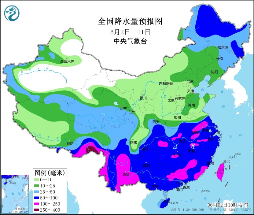 未來10天(6月2-11日),江漢、江淮、江南、華南及西南地區東部等地大部地區累計降水量有50~80毫米,部分地區有100~150毫米;新疆西部、青海南部、甘肅南部、東北地區北部和東部等地累計降水量有20~30毫米、局部50毫米左右;上述大部地區降水較常年同期偏多3~6成,部分地區偏多7成至1倍,我國其餘大部降水偏少或接近常年。