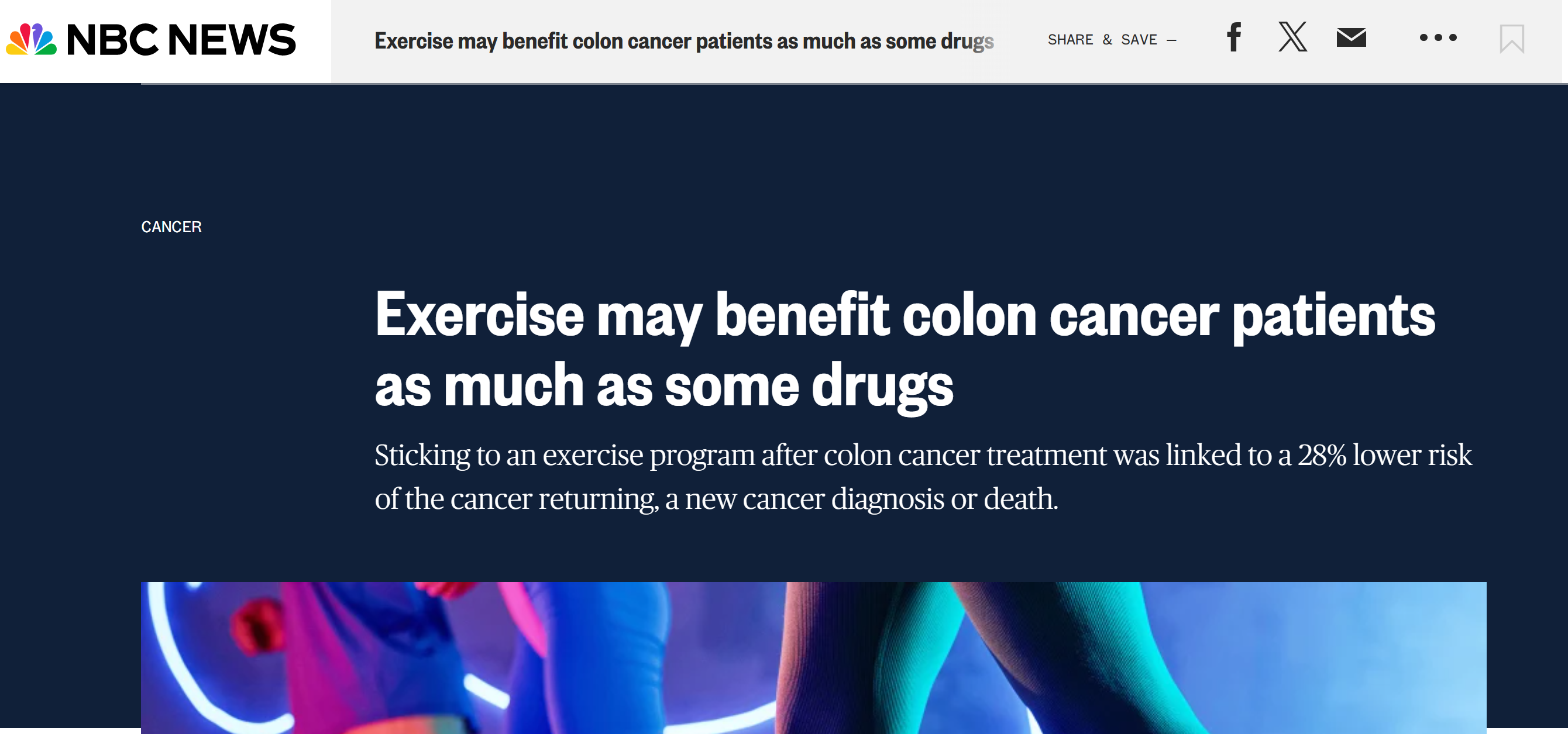 五年後,運動組患者復發或新癌症發生風險比另一組低 28%;八年後,運動組患者死亡風險比僅領取健康手冊的患者低 37%。該研究主要作者、加拿大金斯頓皇后大學的克里斯托弗・布斯博士表示,約 30% 的高危二期和三期結腸癌患者最終會經歷疾病復發,而現在對於患者 “還能做些什麼來改善預後” 的問題,有了明確答案,即包含私人教練的運動計劃可降低癌症復發或患新癌症的風險,讓患者感覺更好並活得更久。