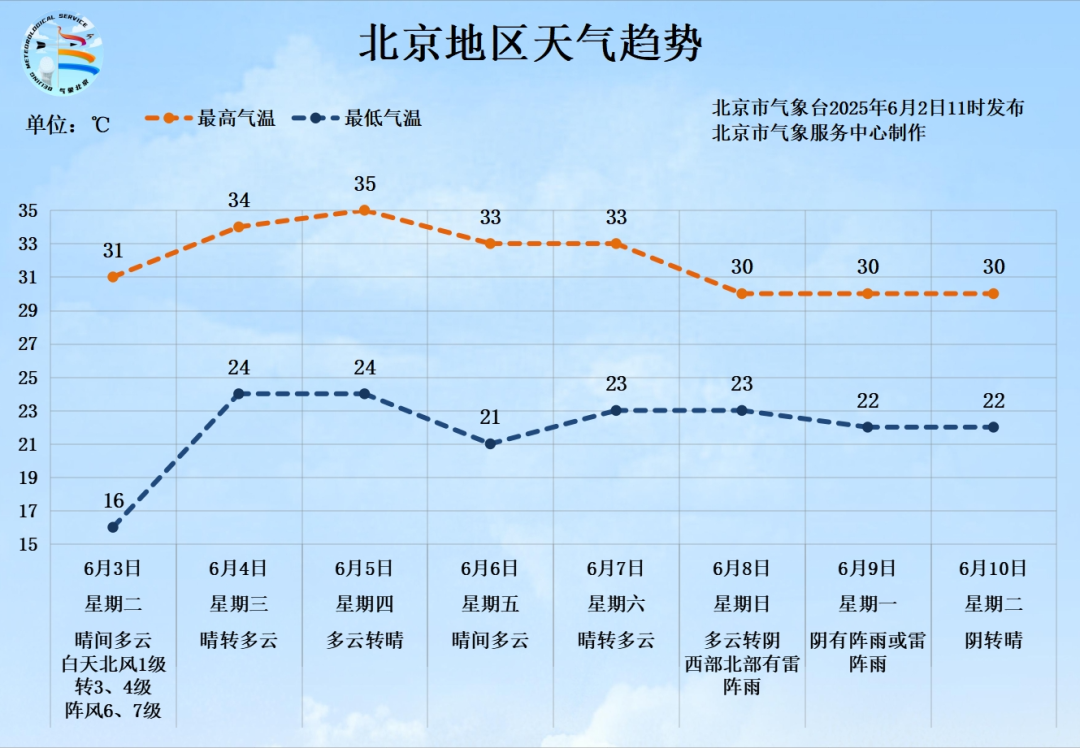 6月3日至6月10日白天最高氣温在30~35℃,夜間最低氣温在16~24℃。