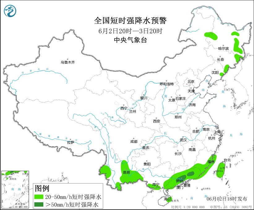 預計6月2日20時至3日20時,東北地區東部和南部、華南中部等地的部分地區將有8級以上雷暴大風或冰雹天氣,其中,吉林西部、遼寧東部和南部等地的部分地區將有10級以上雷暴大風;東北地區中東部、西南地區南部、華南中東部等地的部分地區將有小時雨量大於20毫米的短時強降水天氣,其中,廣東中部等地的部分地區小時雨量大於50毫米。