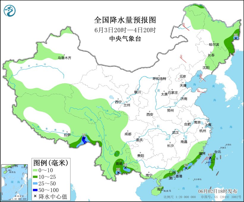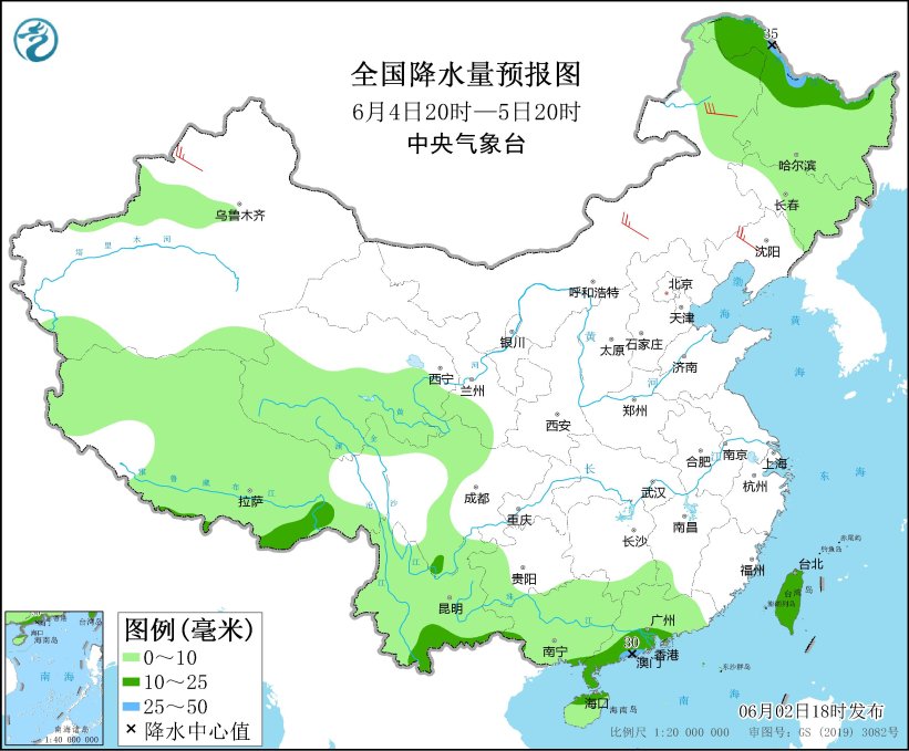 6月2日夜間至3日,廣東中南部、福建東南部、廣西南部、雲南西部和東南部、西藏東南部等地的部分地區有大雨,局地有暴雨或大暴雨(100~150毫米);黑龍江北部、吉林東部等地局部地區有大雨。