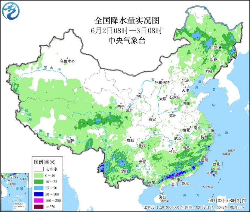 昨日,降雨區分散在東北地區、華南以及雲南等地,氣象監測顯示,廣東中部、廣西東南部、雲南西部、台灣島南部等地部分地區出現大到暴雨,廣東廣州、肇慶、雲浮,廣西玉林等地局地大暴雨(100~176毫米);內蒙古東北部、黑龍江南部以及青海東南部、西藏東南部等地出現中到大雨。