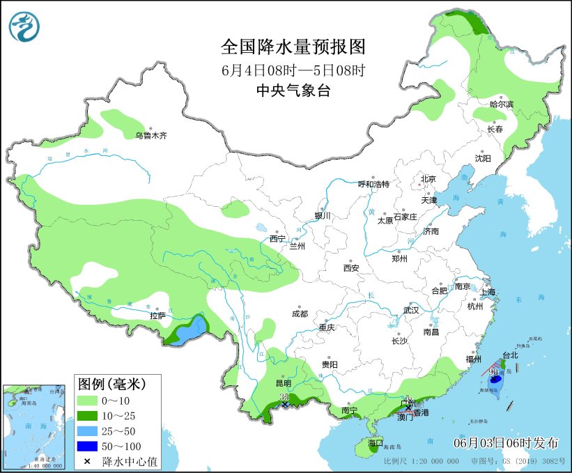 *6月3日08時至4日08時,*台灣島、福建東南部、廣東南部沿海、海南島東部、雲南西部和中東部、西藏東南部和北部、青海南部、內蒙古東部、黑龍江東部和北部、吉林東部等地部分地區有中到大雨,其中,台灣島西部的部分地區有暴雨或大暴雨(100~150毫米),西藏東南部、雲南東南部、廣東南部沿海的局地有暴雨。內蒙古中東部、河北北部等地部分地區有4~6級風(見圖1)。