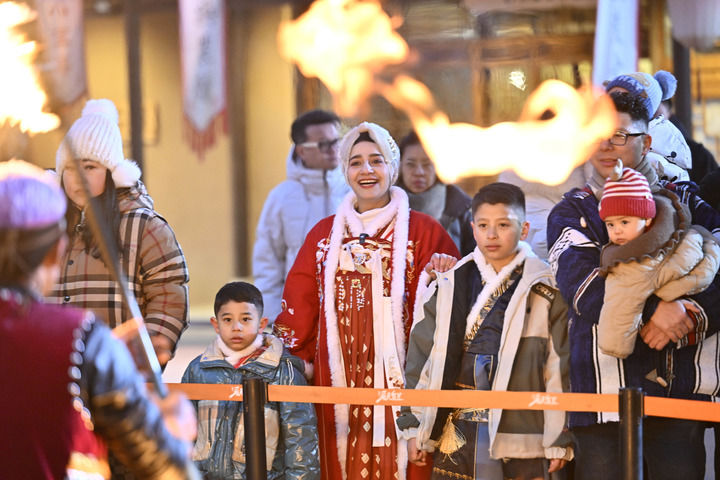 外國友人在“漫葡·看見賀蘭”沉浸式演藝小鎮內觀看演出(2025年1月14日攝)。新華社記者 王鵬 攝