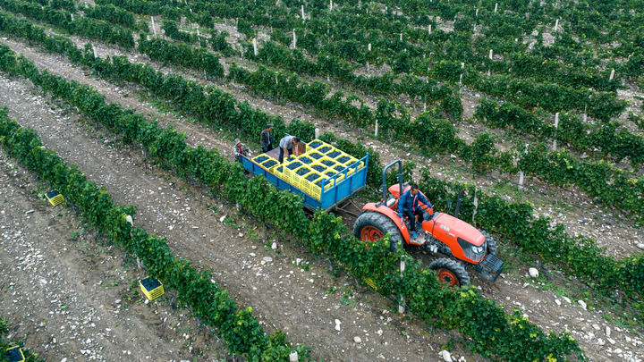 工人在寧夏沃爾豐釀酒葡萄種植基地轉運採摘下的釀酒葡萄(2024年9月19日攝,無人機照片)。新華社記者 王鵬 攝