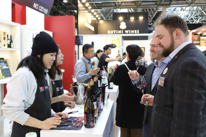 在德國杜塞爾多夫舉行的2025年杜塞爾多夫葡萄酒與烈酒展上,參觀者品嚐中國寧夏產區的葡萄酒(2025年3月16日攝)。新華社記者 劉向 攝