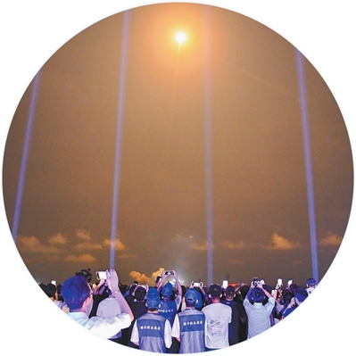 “5,4,3,2,1”——火箭的火焰照亮夜幕,平台的光束射向天際……19時50分,火箭發射升空,遊客們舉着手機記錄,現場歡呼聲陣陣。“很興奮、很震撼,感覺一伸手就能‘抓’到火箭。”延鈺菲説。