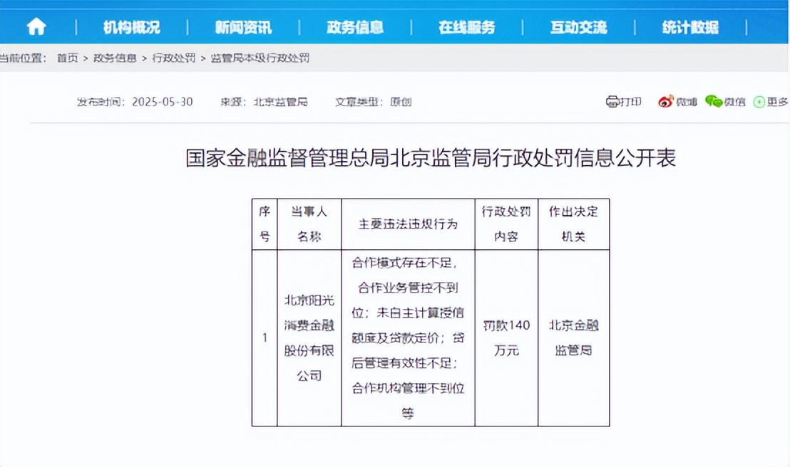 【環球網財經綜合報道】近日,國家金融監督管理總局北京監管局對北京陽光消費金融股份有限公司(以下簡稱“陽光消費金融”)開出140萬元罰單,並核准其公司章程修訂。這一“一罰一批”的罕見操作,再次凸顯消費金融行業強監管態勢。