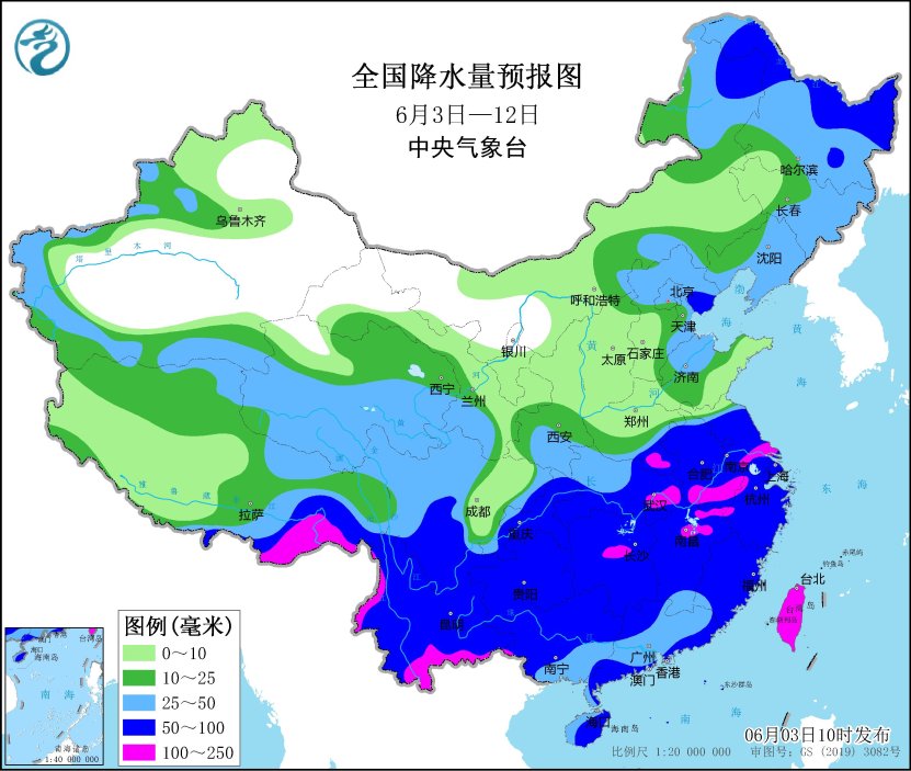 未來10天(6月3-12日),江漢、江淮、江南、華南及西南地區東部等地大部地區累計降水量有50~80毫米,部分地區有100~120毫米;新疆西部、西北地區東南部、華北東部、東北大部等地累計降水量有20~30毫米、局部50毫米左右;上述大部地區降水較常年同期偏多3~6成,部分地區偏多7成至1倍,我國其餘大部降水偏少或接近常年。