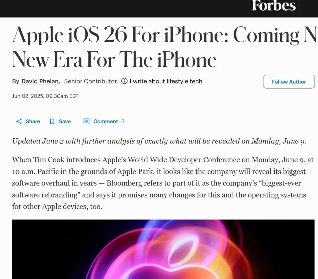 【環球網科技綜合報道】6月3日消息,據forbes報道稱,蘋果公司即將在 6 月 9 日的全球開發者大會上公佈一項重大軟件改革 —— iOS 26。這一更新被彭博社稱為蘋果 “有史以來最大的軟件品牌重塑” 之一,將“開啓 iPhone 新時代”。